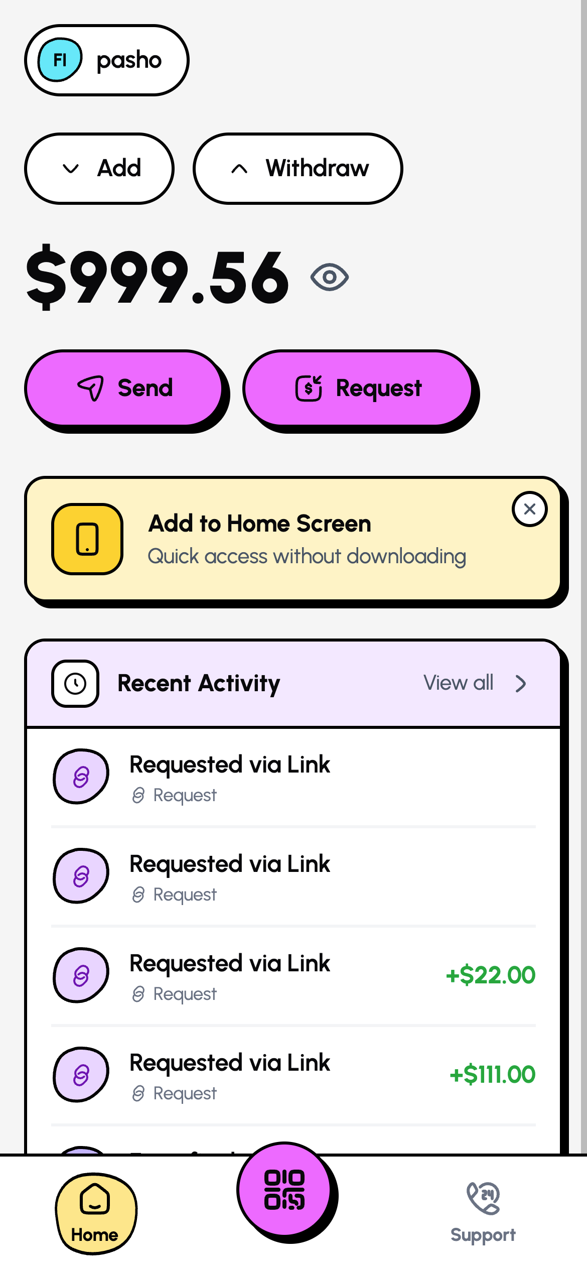 Send money via link, QR code, or username. Recipients don't even need an account to claim.